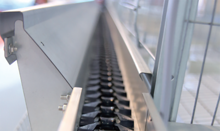出料口安裝有勻料器、趕雞棒、首尾段殘料回收裝置,減少飼料浪費且喂料均勻,喂料量可根據(jù)日齡、雞品種進行調節(jié),保證雞營養(yǎng)充足、均衡。